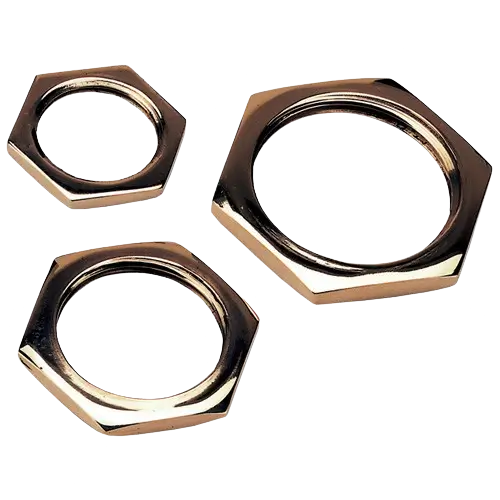 Metal or plastic nuts used with cable glands to securely fasten them to panel walls or enclosures.